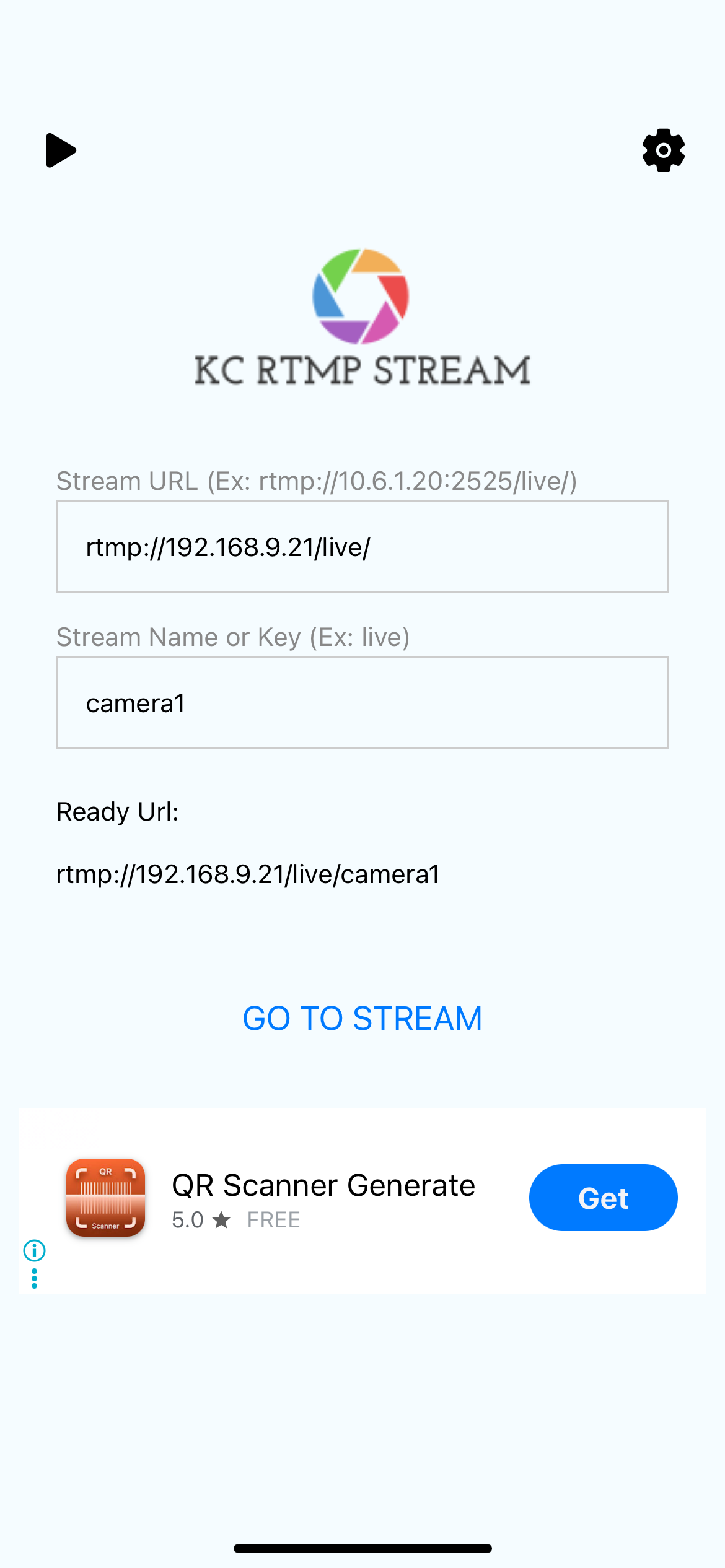 For simplicity in this tutorial we'll use a smart phone camera. Any RTMP stream app will do, we'll use KC RTMP Stream App here (for iOS, for Android).